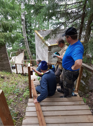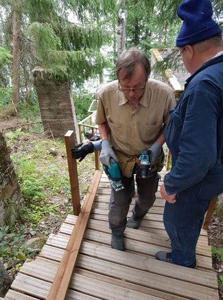 Myllykoskihankkeemme harjannostajaiset pidettiin myllyllä 29.9.2018. Juhlimme vuosien 2016, 2017 ja 2018 rakennustyötä. Olemme rakentaneet talkoilla huussiliiterin, laavun ja kodan sekä runsaasti portaikkoja, joista rakennuksiin johtavat mahdollistavat myös pyörätuolilla liikkumisen.